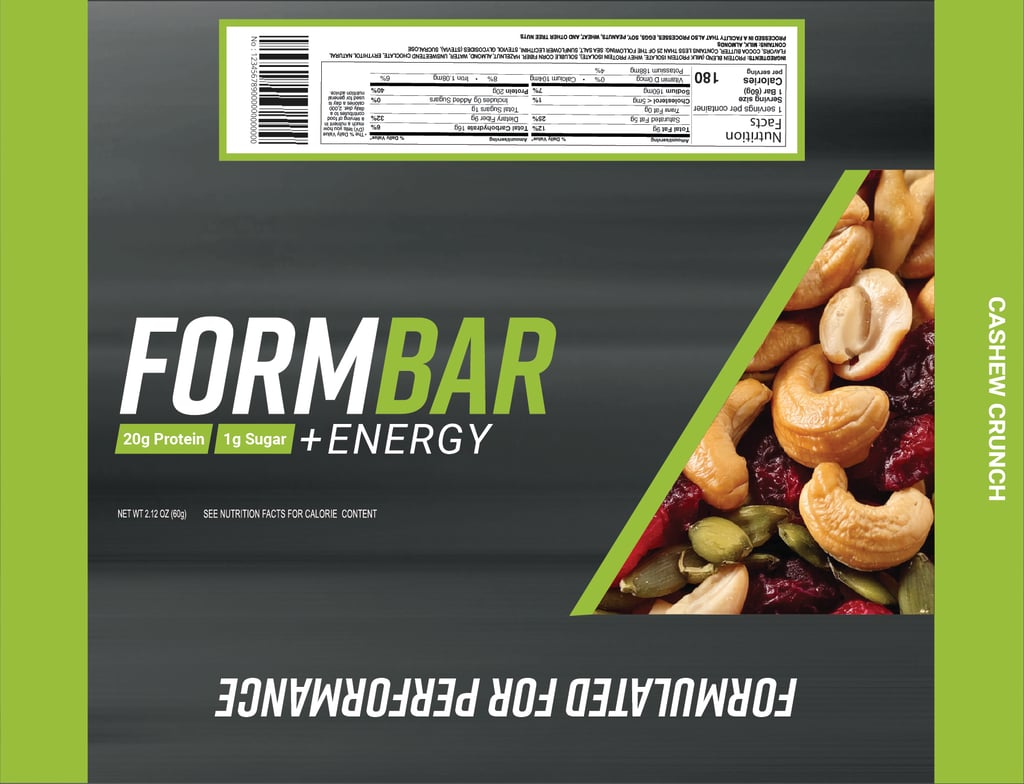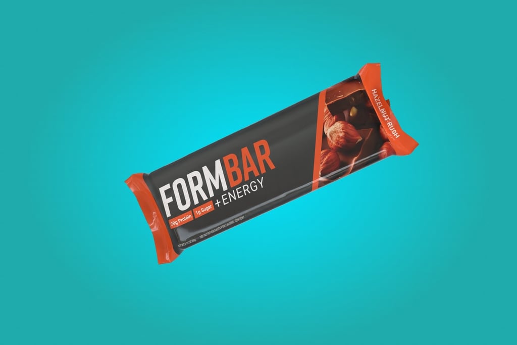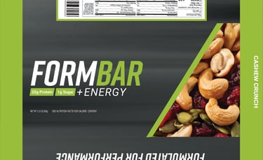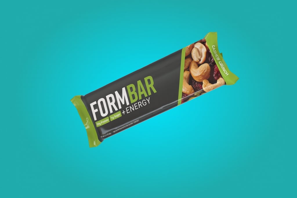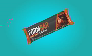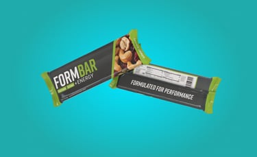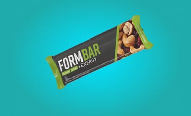 The name FormBar represents a perfectly balanced formula of high-protein ingredients, crafted for peak performance. As highlighted on the back of the packaging, it is "formulated for performance," supporting athletes both in energy and in refining their form. The packaging design conveys a sense of kinetic energy through bold color stripes and dynamic diagonal lines, helping it stand out.